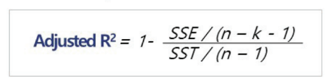 - Adjusted R^2 : 독립변수를 추가하면 R^2 값은 상승하므로 Adjusted R^2 사용.