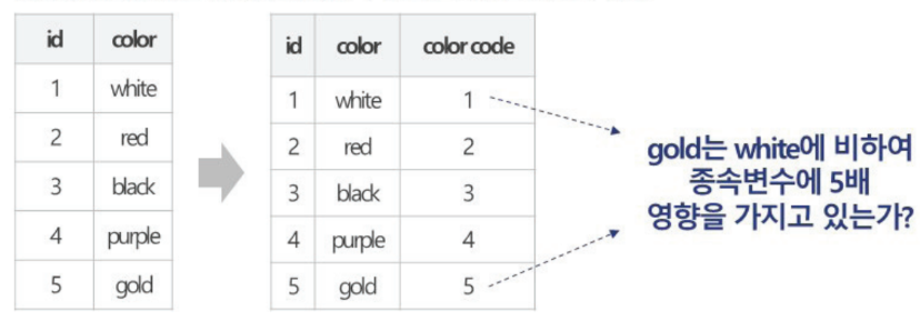 - 범주형 데이터를 수치형 데이터로 변환( 숫자 형태 code로 변경, 범주형 자료 0과 1로 표현- one hot encoding)