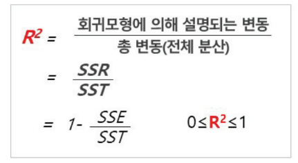 - 0<= R^2 <= 1 , 1에 가까울수록 인과관계 높다.