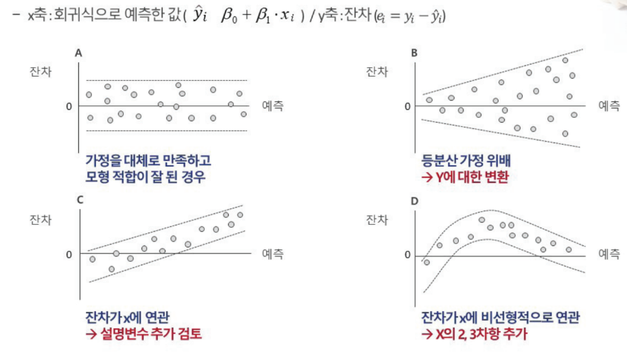 A: 등분산,독립, B:등분산 X, C : 독립X, D : 선형성만족X