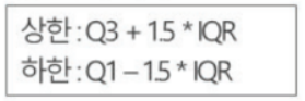 Tukey : 기준은 Q1, Q3 : 상한,하한을 벗어나는 값을 이상값으로 간주, 제거 가능