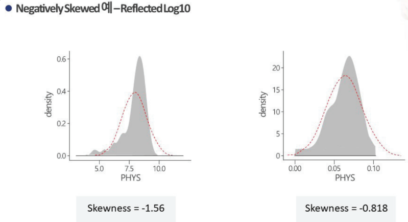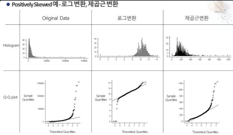 Positively Skewed (오른쪽 꼬리 긴 그래프) : Sqrt(x) -> log10(x) -> 1/x