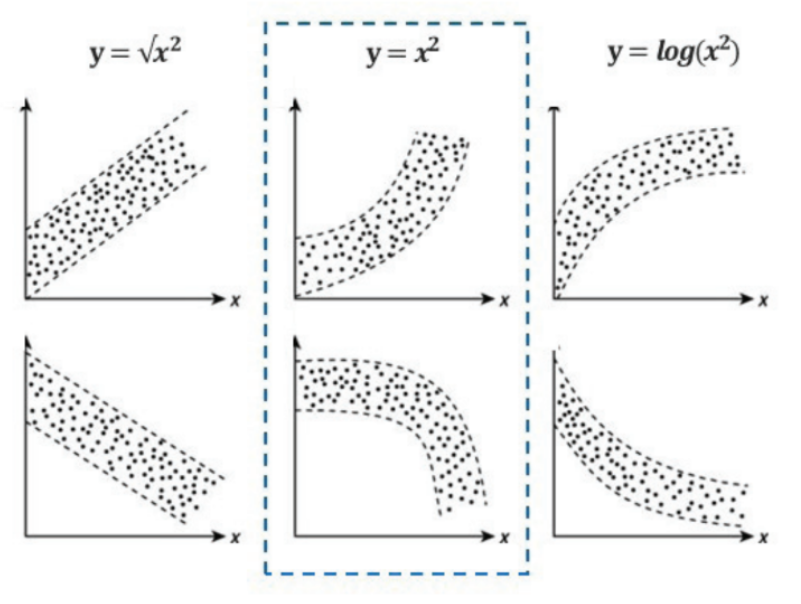종속변수 증가가 독립변수 증가보다 급격할 때 : log변환 시도