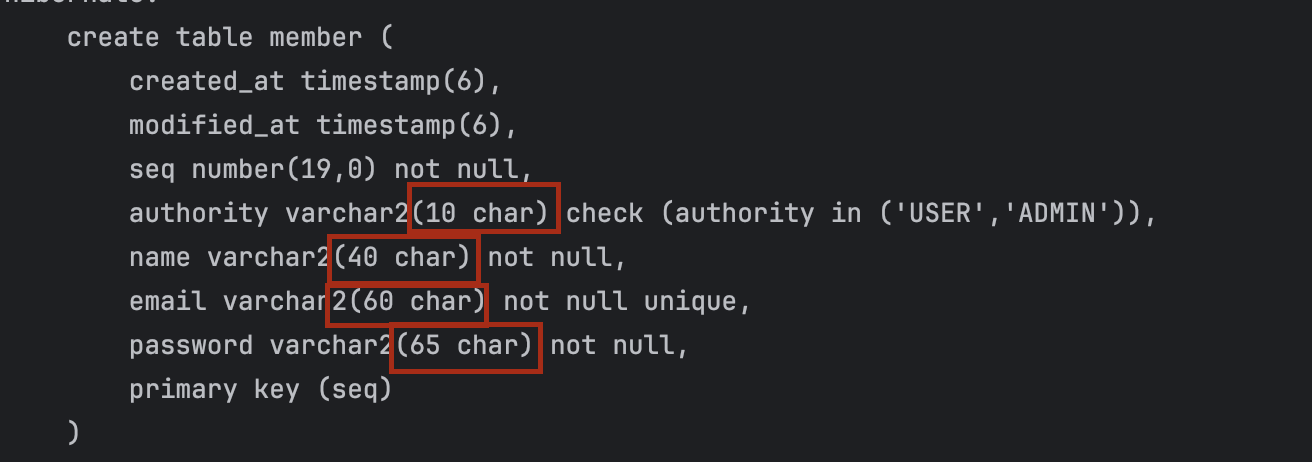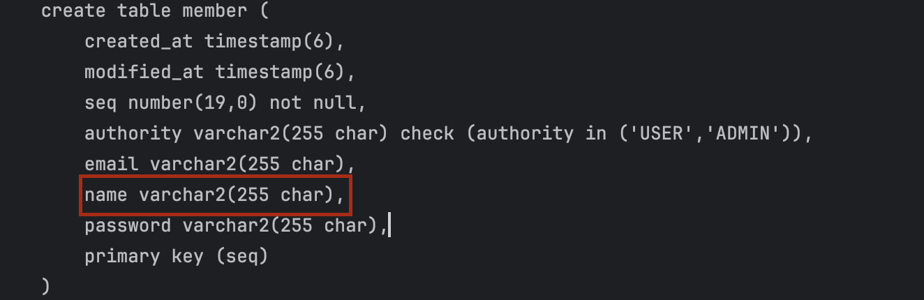 @Data @Entity //엔티티 에노테이션 설정하면 자동으로 테이블이 생성 @Table(name="CH_MEMBER") public class Member { @Id private Long seq; private String email; private String password; private String userName; private LocalDateTime createdAt; private LocalDateTime modifiedAt; }