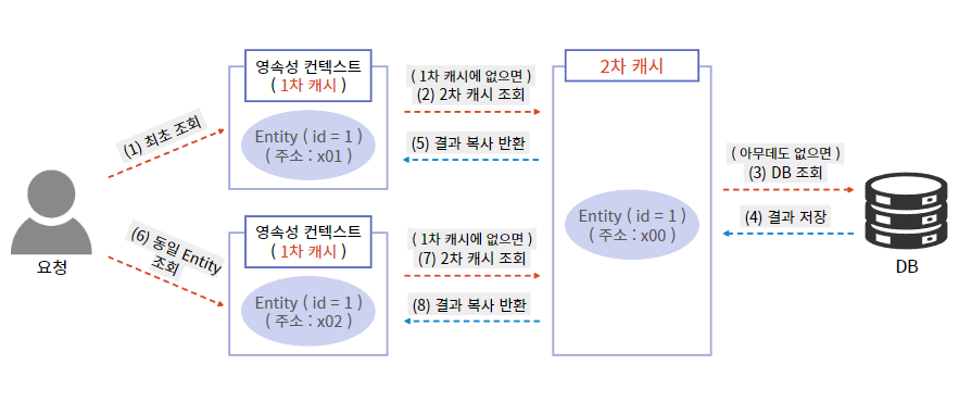 - clear()를 선택해서 영속 상태 엔티티 모두 비운다면, 캐시에 엔티티가 없기 때문에 DB에서 조회를 해서 가져오고, 캐시에 저장한다.