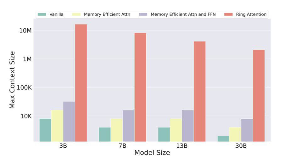 - 위의 그래프에서도 확인할 수 있듯이, Ring attention 기법을 적용하면 context size를 엄청나게 늘릴 수 있다.