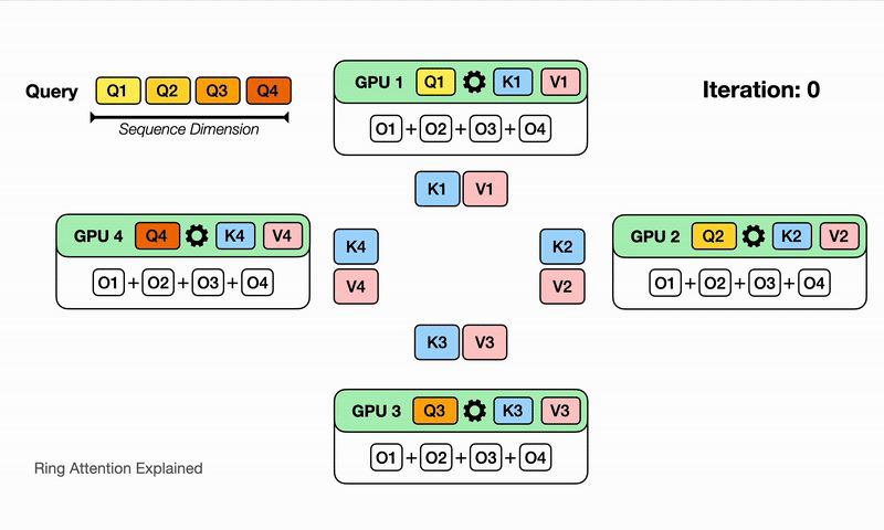각 device(GPU)가 query block을 보유하고, key-value block이 device를 돌아다니면서 attention을 계산하여 넘기는 방식으로 동작하기 때문에, sequence의 길이가 아무리 길어져도 GPU 개수만 충분하다면 충분히 해소가능하다.