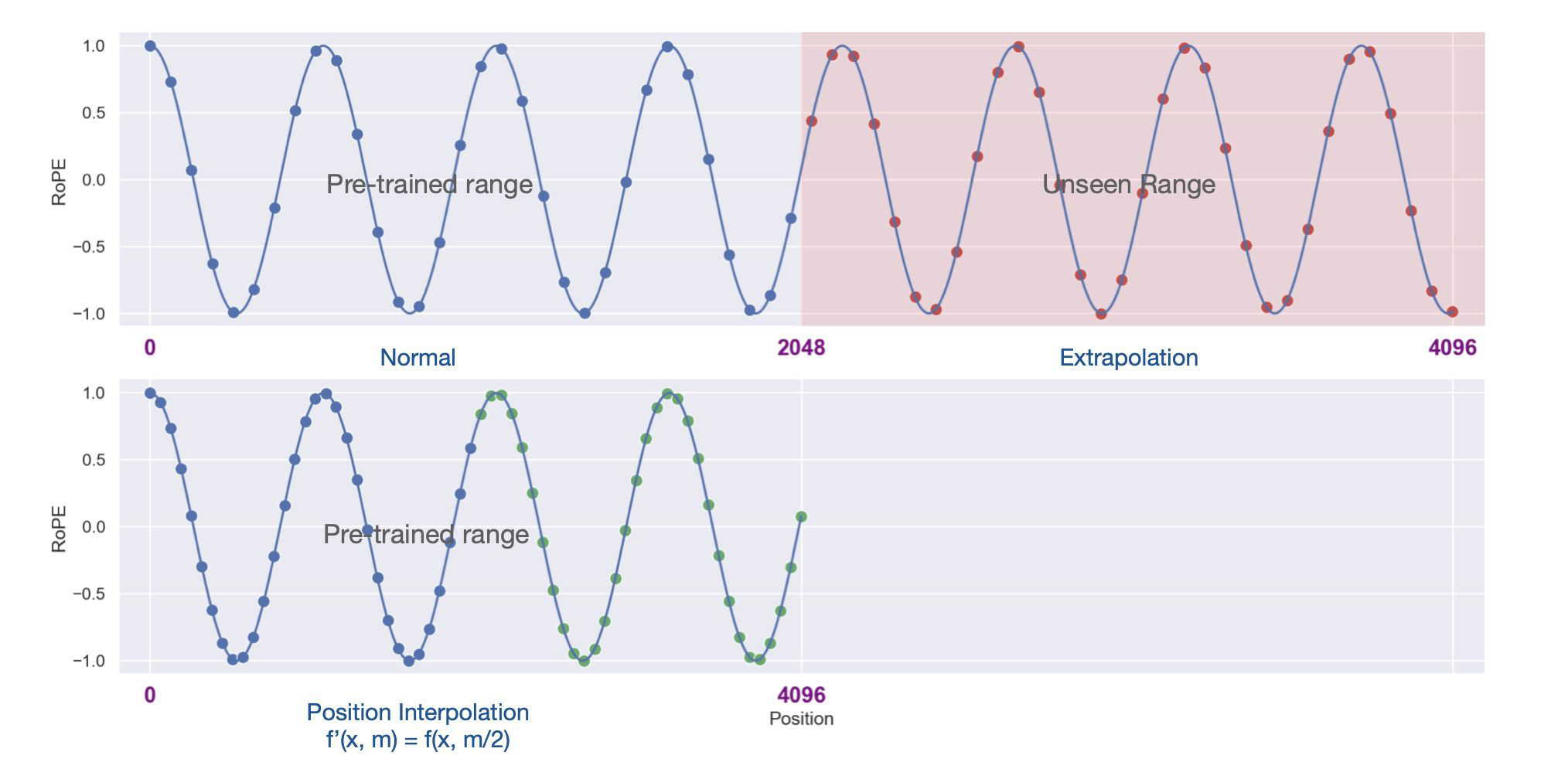 - 위의 그림과 같이 기존 pre-trained 범위(~2048)에서 unseen range 범위(~4096)로 늘려주어 RoPE 위치 정보를 down-scaling 해주는 것이다.
