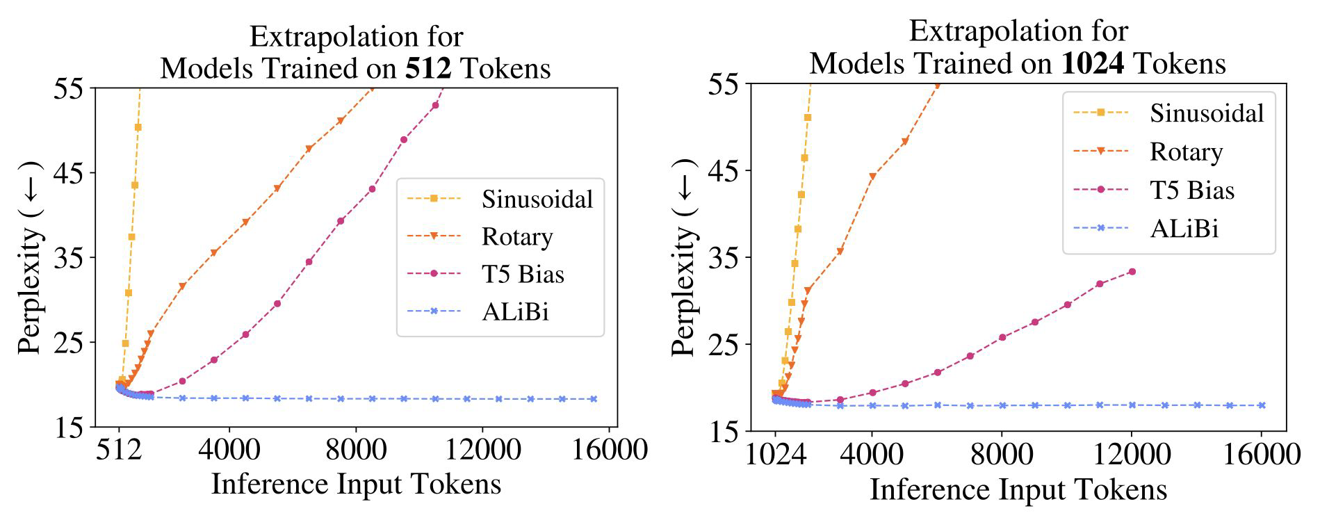 - 위의 그림을 보면 ALiBi를 처리하였을 때, input token 길이가 길어지더라도 perplexity가 유지되는 것을 확인할 수 있다. (성능이 저하되지 않음)