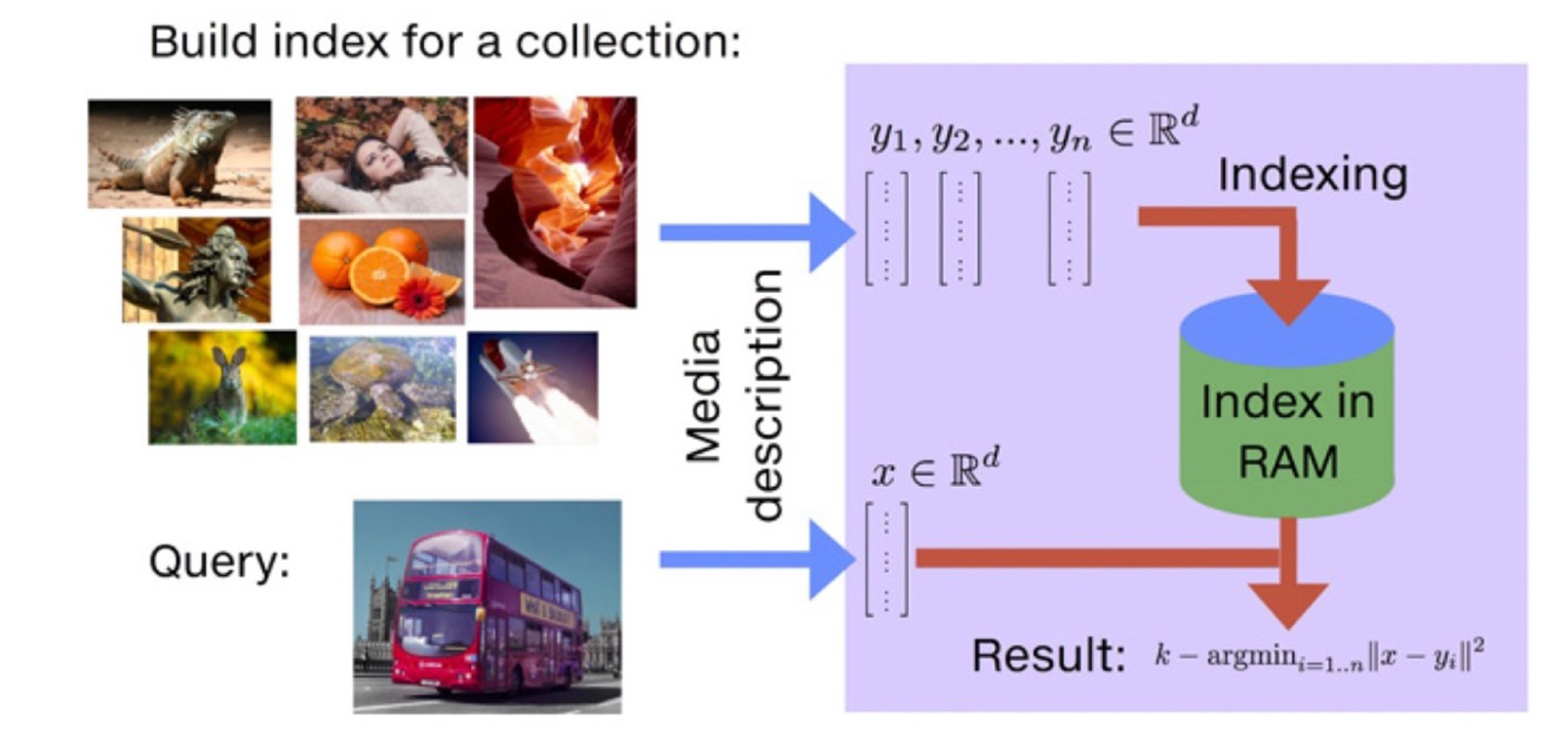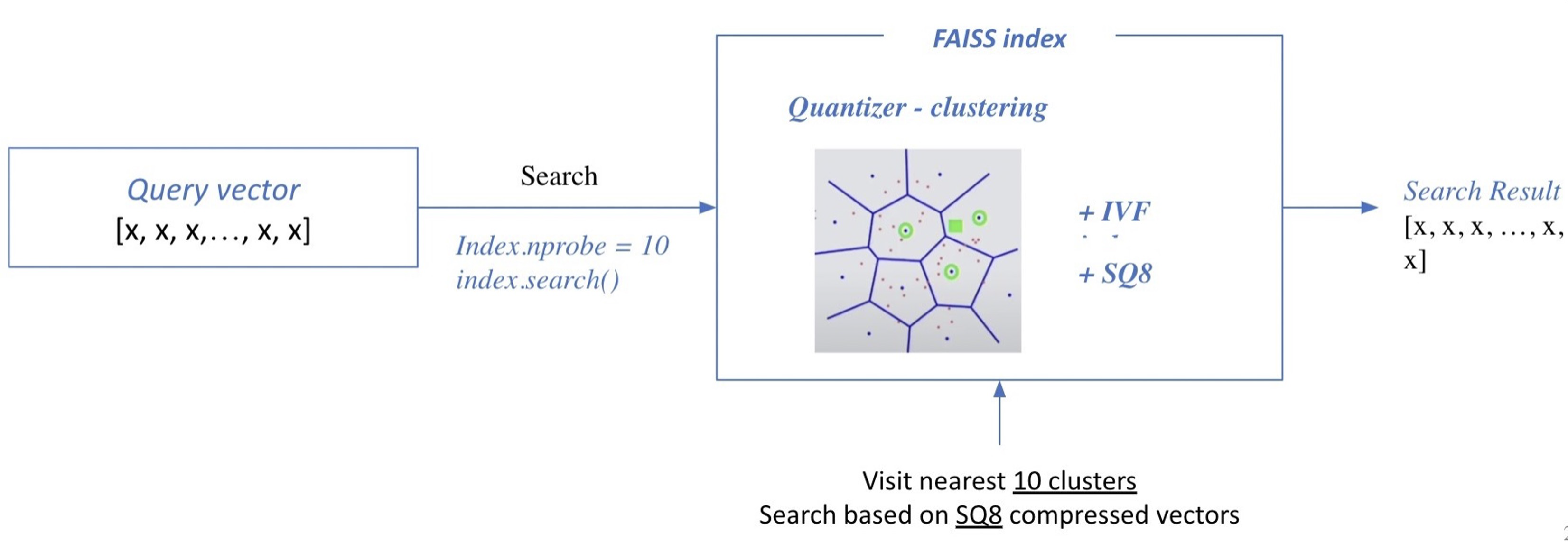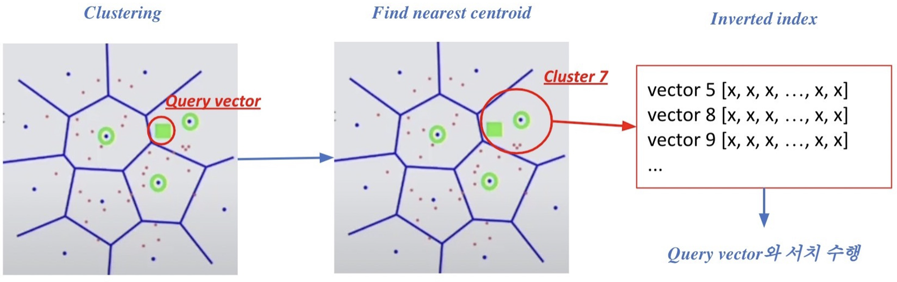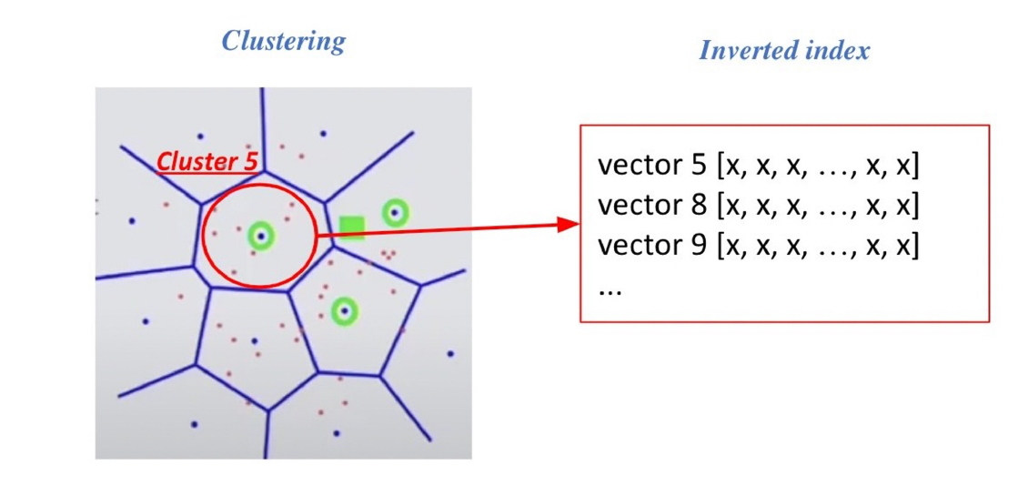 위의 그림은 Clustering과 IVF를 활용하여 검색하는 방식을 보여준다. 먼저 주어진 query vector에 대해 근접한 centroid vector를 찾는다. 그런 다음 찾은 cluster의 inverted list 내 vector들에 대한 search를 수행한다. 이러한 과정은 cluster에 속해 있는 벡터들을 빠르게 확보가 가능하기 때문에 search space를 많이 줄일 수 있다.