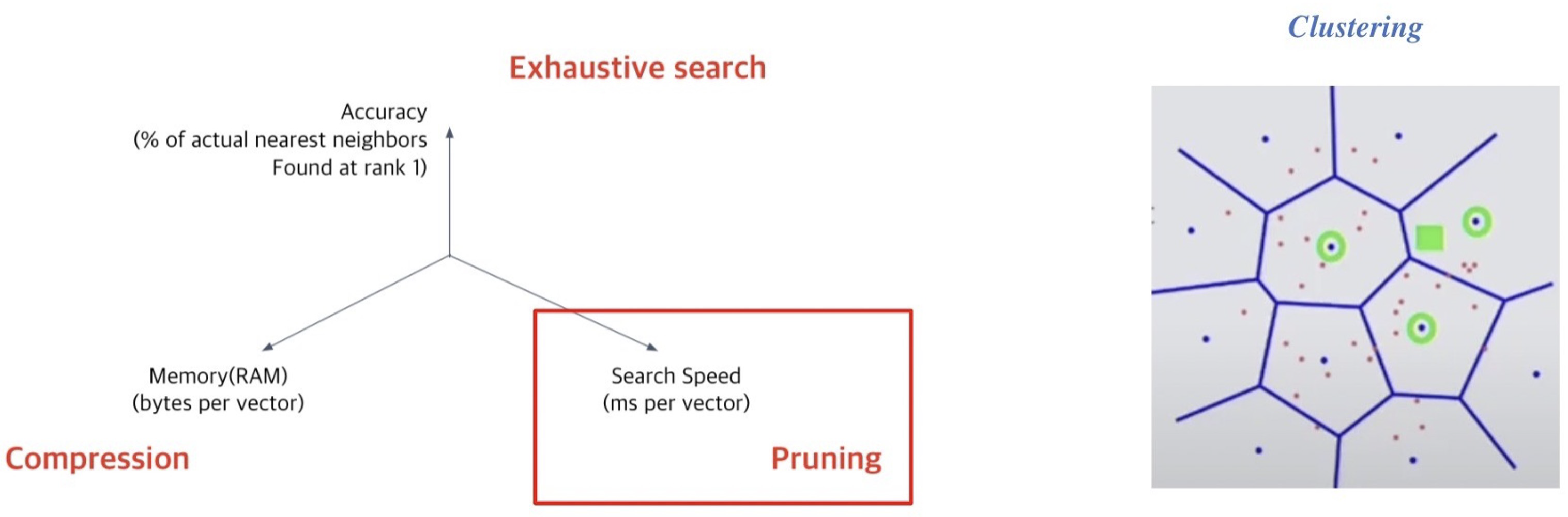 Pruning은 Search space를 줄여서 검색 속도를 개선하기 위한 방식으로, dataset의 subset만 방문한다. 보통 Clustering과 IVF를 활용하여 검색을 진행한다.