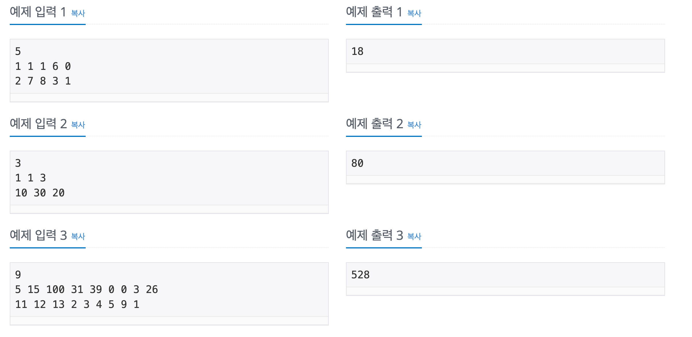 첫째 줄에 N이 주어진다. 둘째 줄에는 A에 있는 N개의 수가 순서대로 주어지고, 셋째 줄에는 B에 있는 수가 순서대로 주어진다. N은 50보다 작거나 같은 자연수이고, A와 B의 각 원소는 100보다 작거나 같은 음이 아닌 정수이다.