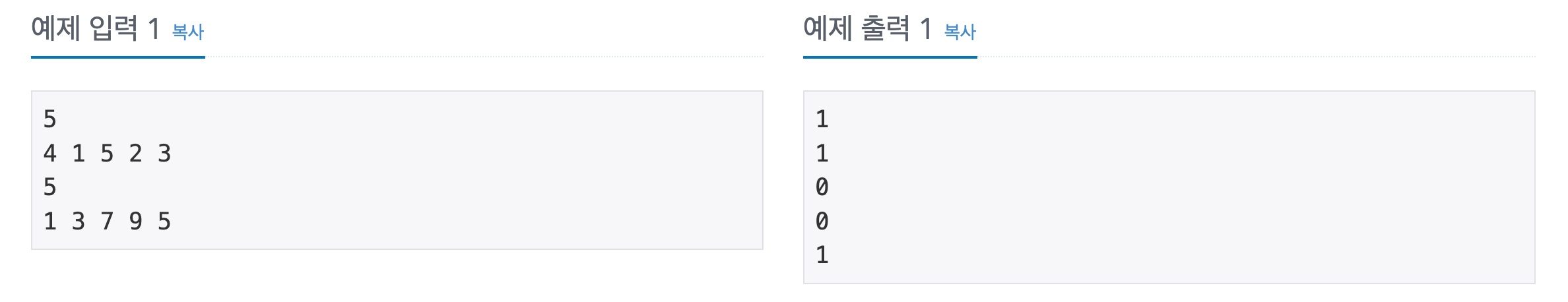 첫째 줄에 자연수 N(1 ≤ N ≤ 100,000)이 주어진다. 다음 줄에는 N개의 정수 A[1], A[2], …, A[N]이 주어진다. 다음 줄에는 M(1 ≤ M ≤ 100,000)이 주어진다. 다음 줄에는 M개의 수들이 주어지는데, 이 수들이 A안에 존재하는지 알아내면 된다. 모든 정수의 범위는 -231 보다 크거나 같고 231보다 작다.