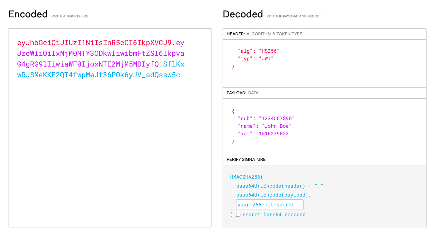 아래 화면은 인코딩 이전의 JWT의 원형이 어떤 모양인지 대략 느껴볼 수 있는데 특히 Signature 부분을 주의해서 볼 필요가 있습니다. Signature는 Base64로 인코딩된 header와 payload를 비공개 키로 해싱한 결과값을 한번 더 Base64로 인코딩한 값입니다.
