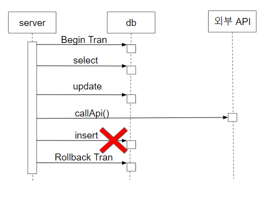 transaction작업 도중에 외부 api 호출이 있은 후, insert 작업을 처리하다가 오류가 생기는 상황이 발생했다.rollback할 수 있겠지만, 외부 api를 호출했던 외부 서버는 트랜잭션을 보장할 수 없을 것이다.정리하면 transaction은 다음과 같은 성질들을 가진다.