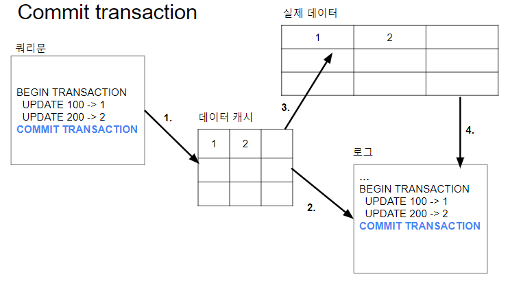 Transcation으로 묶었던 작업의 결과를 실제 DB에 반영해야한다.Commit하여 Commit한 내용도 로그 파일에 기록한다.데이터 캐시에서 변경한 내용을 실제 데이터에 덮어쓴다.checkpoint가 만들어 지며 언제든 해당 지점으로 데이터를 복구할 수 있다.