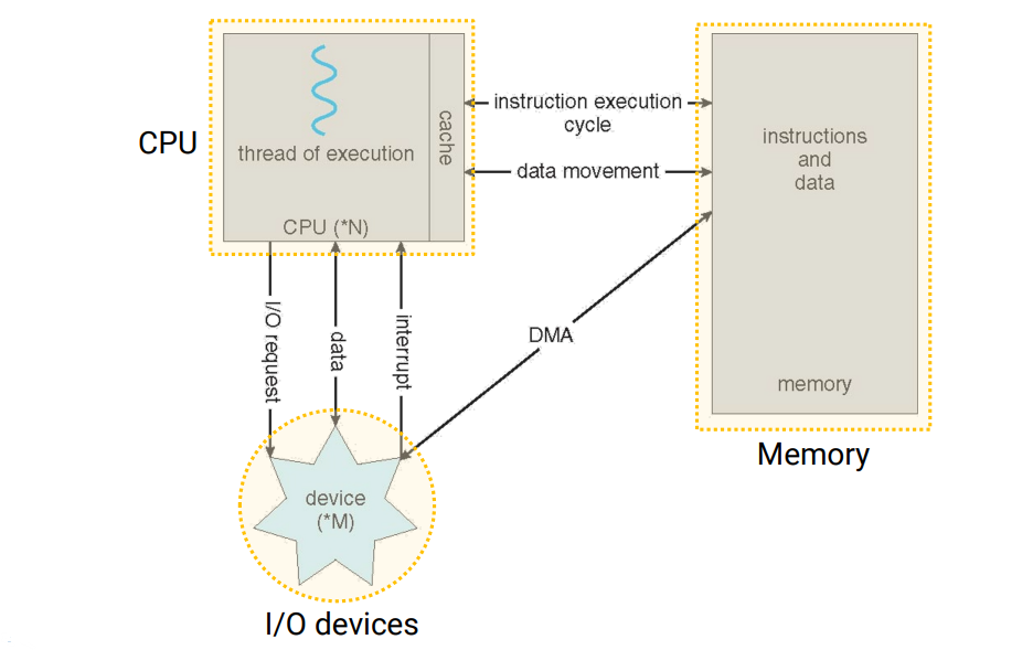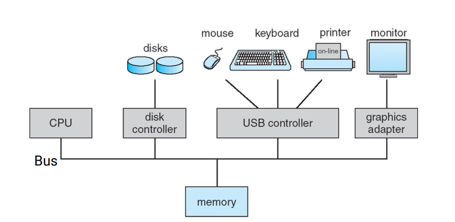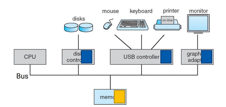 90년대 2000년대 컴퓨터 시스템 구조이다. bus는 대용량 데이터를 전송하는 전선 같은 거다. 컴퓨터에 있는 모든 component들은 다 이 common bus에 붙어 있다. 그러나 cpu와 memory와 달리 i/o 디바이스는 버스에 직접 붙어 있지 않다. 이 디바이스를 관장하는 device controller에 연결돼 있고 이 controller가 bus에 연결돼 있다.