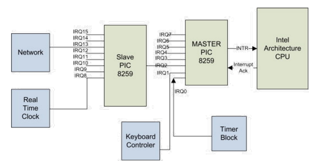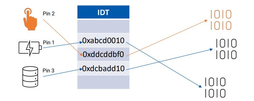어떤 interrupt handler를 불러야 할지는 software가 아니라 hardward 파트로 만들어져 있다. 특정 핀에 전압이 걸리면 하드웨어가 자신이 아는 Interrupt Descriptor Table(IDT)(mem에 있음, 내가 실행해야 하는 코드의 주소가 쓰여 있음) 를 보고, 해당하는 위치에 있는 주소로 가서, 그 주소에 있는 instr을 가져와 처리한다. 이 IDT는 cpu마다 다르고 특정 핀에 대한 핸들러의 위치는 os가 컴퓨터가 부팅될 때 써준다.