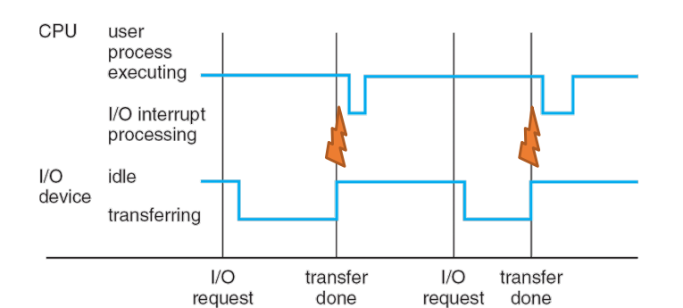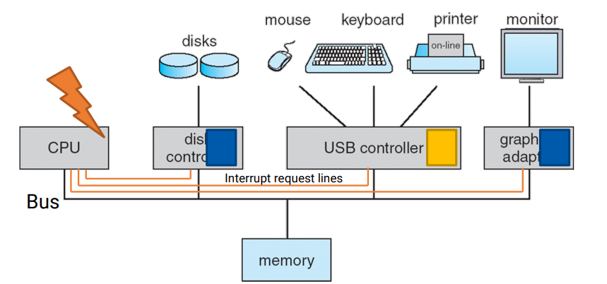 cpu가 d.c한테 "가져다 두었냐?" 계속 물어보는 건 PIO 형태이다. "가져다 두었으면 알려줘라" 이 방식이 interrupt이다. cpu와 controller 사이에는 interrupt를 날릴 수 있는 interrupt request line이 있다. (interrupt를 날리는 건 그냥 전선에 전압을 걸면 되는데, 이건 hardware logic으로 처리한다.)