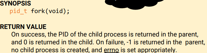 (parent와 child의 PID는 서로 다르고, fork가 성공했을 때의 return value가 parent는 child의 pid, child는 0임)