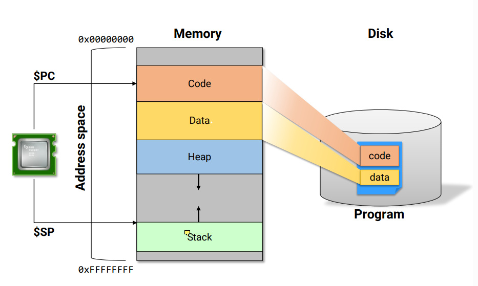 각 프로세스들이 동작하며 자신이 참조할 수 있는 메모리 영역이 생기는데, 그 영역을 Address space라고 한다. Address space는 code, data, heap, stack으로 구성돼 있다. Disk에 저장된 프로그램에는 code와 data밖에 없다. Heap과 Stack은 프로그램이 실행되면서 동적으로 공간을 확보하고 반환한다. (code와 data는 실행하면서 크기가 바뀌지 않는다.)