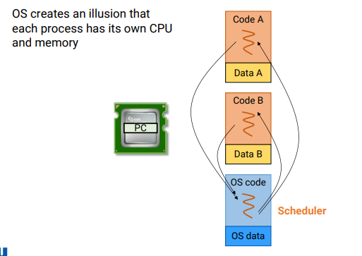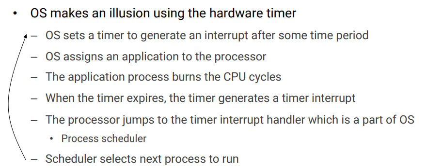 -> 즉, A가 돌다가 timer interrupt 터지면 timer handler로 jump함. handler code 실행하다 보면 scheduler 코드로 와서 다른 process 돌릴 수 있게 됨