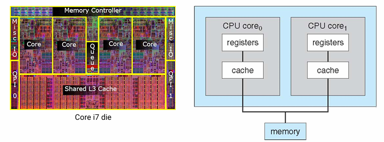 - 여러 core가 가까이 위치해 있고, resource를 공유함으로써 시스템의 성능과 효율성을 높일 수 있음
