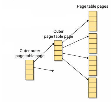- 가장 outer에서 0b01이 가리키는 page table page로 가서 01번째가 가리키는 page table page로 가서 01번째 ... 이렇게 해석하면 된다.