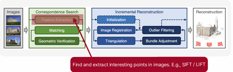 이미지를 설명하는 local feature들을 추출하는 과정이다. local feature란, 두 이미지를 비교할 때 대응 관계 (correspondence)를 형성하는 특징점(+ 그 주변 정보)들을 의미한다.