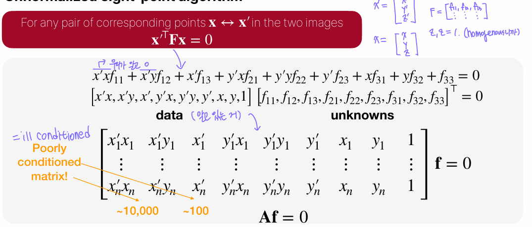 다만 이 A matrix는 ill-conditioned matrix이므로 normalization 과정(좌표들을 곱한 값이 특정 범위에 들어오게끔 하는 과정)이 반드시 필요하다.