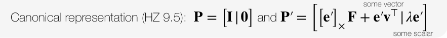 이 ambiguity를 제거하기 위해 특정한 카메라 행렬을 선택하는 방법을 canonical form of camera matrices라고 한다. 즉, 두 개의 카메라 행렬을 아래와 같은 표준적인 형태로 변환하여, 불필요한 자유도를 제거한다.