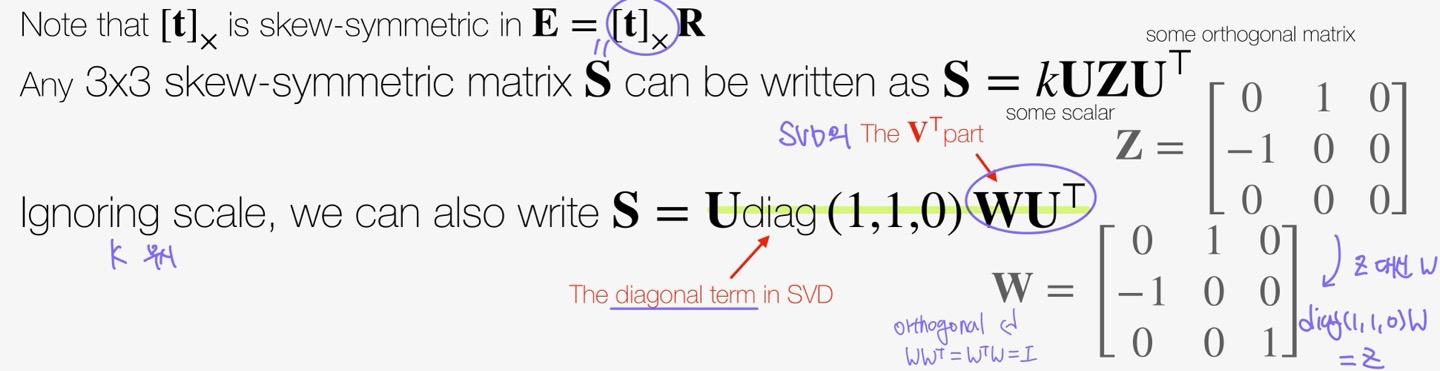 이동 벡터 는 skew-symmetric matrix이므로 와 를 곱하면 항상 0이 나온다. 이 점을 이용하여 를 구할 수 있다. 즉, 는 의 null space에 속하는데 를 SVD한 결과가 이므로 t는 행렬의 세 번째 열과 동일해야 한다. (부호는 알 수 없음)