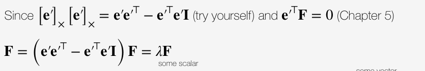 skew-symmetric matrix 끼리 곱한 값을 계산하면 결과가 나오고, 이므로 식을 마저 전개하면 아래와 같이 나온다. 에 두 번째 카메라 행렬 을 대입하여도 같은 값 가 나왔으므로(homogeneous system임) 설정된 두 번째 카메라 행렬이 타당하다는 것을 알 수 있다.