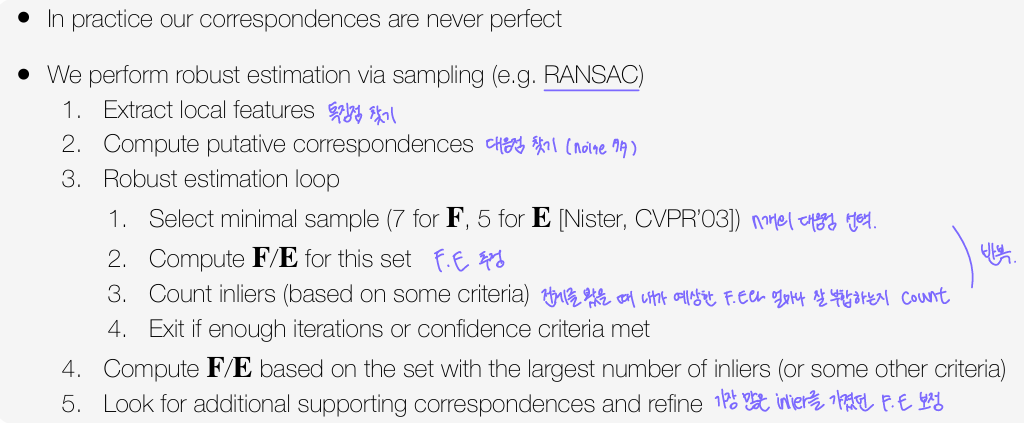 일반적으로 robust estimation이라고 하면, RANSAC으로 대표되는데 이 알고리즘은 거의 모든 pose estimation, camera estimation에 다 들어간다.