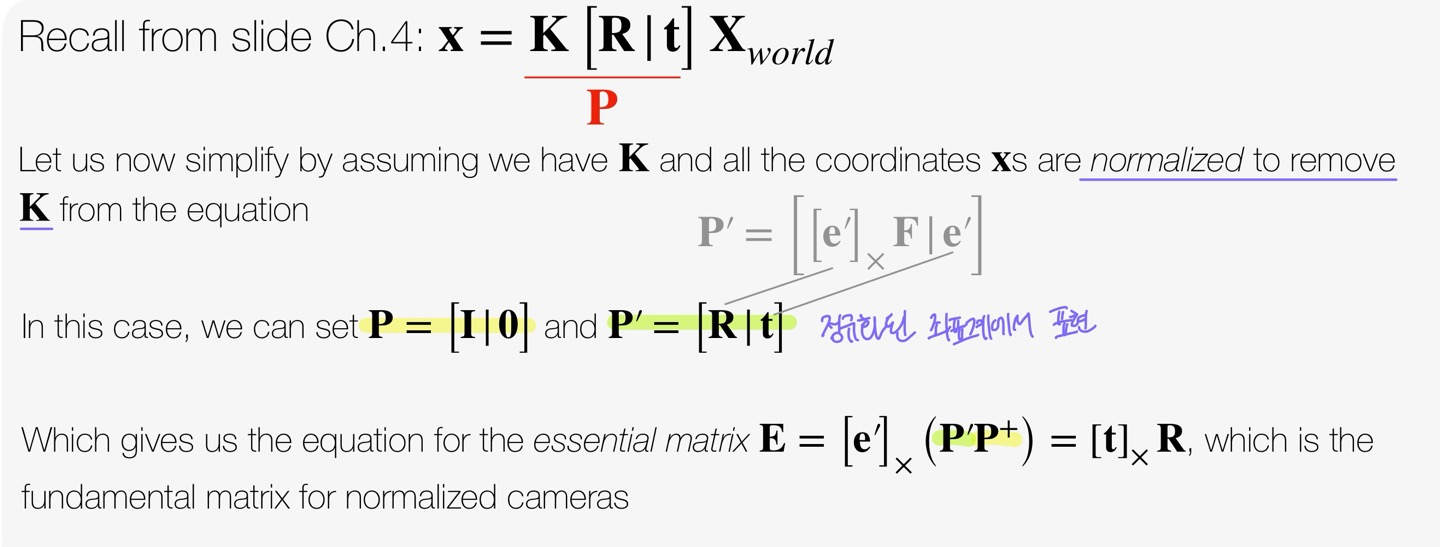 우리가 좌표를 정규화(Normalized Coordinates)한다고 가정하면, 내부 파라미터 K가 사라지므로 아래와 같이 단순화할 수 있다.