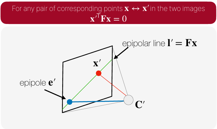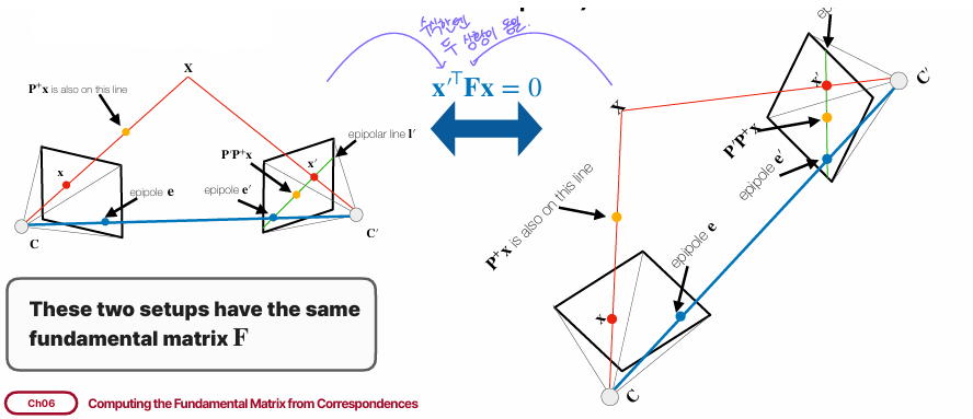 여태까지의 파트에서 가장 중요했던 것은 이 수식이다. 이 수식을 통해 카메라 간의 연관관계를 설명할 수 있었고, fundamental matrix를 가운데에 두고 양쪽에 대응점을 곱했을 때 0이 되어야 한다는 게 epipolar geomatrix를 자체를 나타낸 수식이다라는 걸 명심하자.