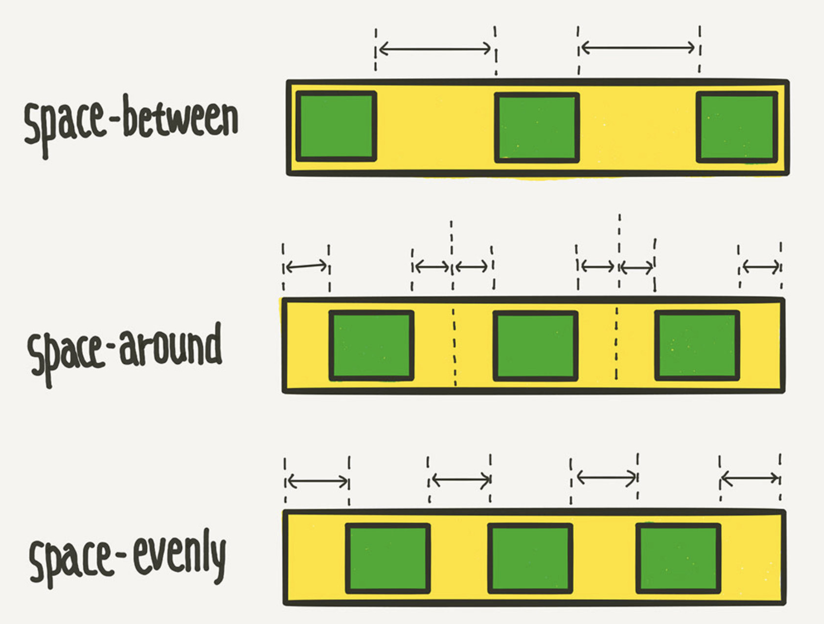 space-around 각 flex items의 외부 여백을 균등하게 정렬.