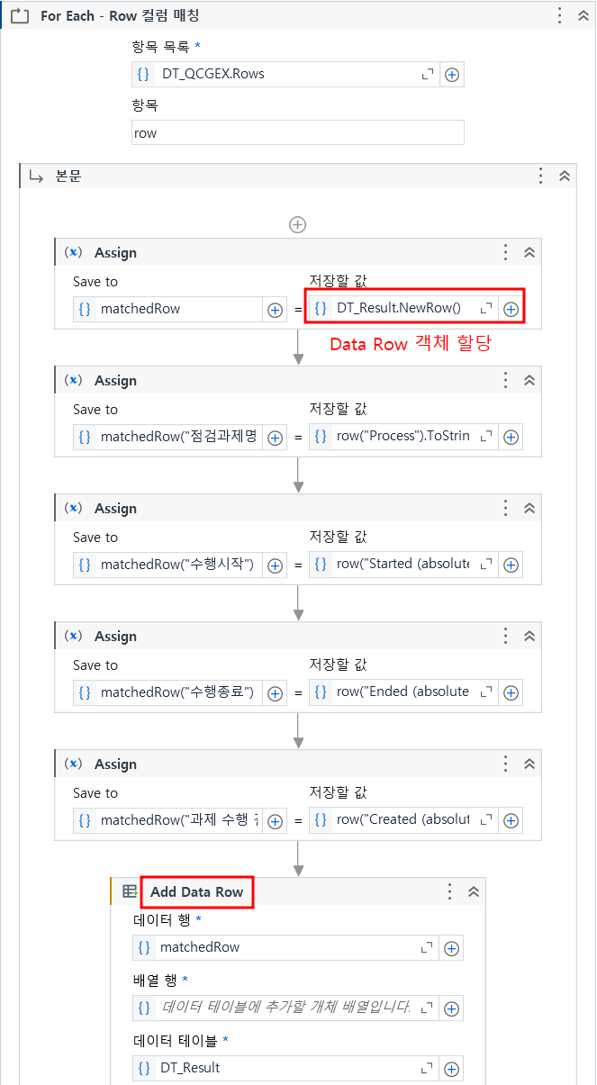 이제 컬럼에 맞게 값을 하나씩 할당 해주고 add data row 액티비티를 사용해서 DT_Resul에 넣어준다