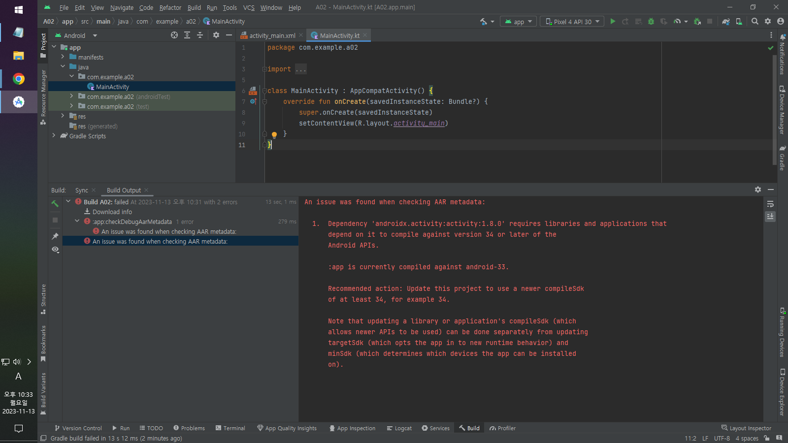 일단 build.gradle 파일에서 compileSdk와 targetSdk를 33에서 34로 바꾸니 해결.