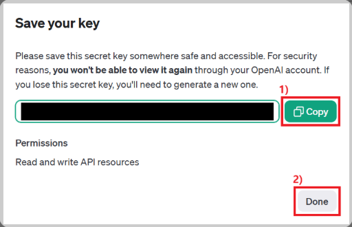 ‼️해당 API Key의 정보는 최초 1회만 보여지기 때문에 Done을 클릭하는 순간 다시 조회할 수 없다.‼️