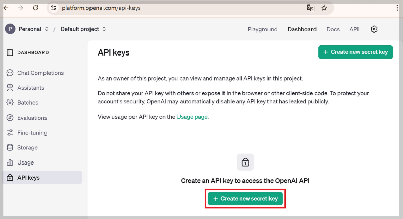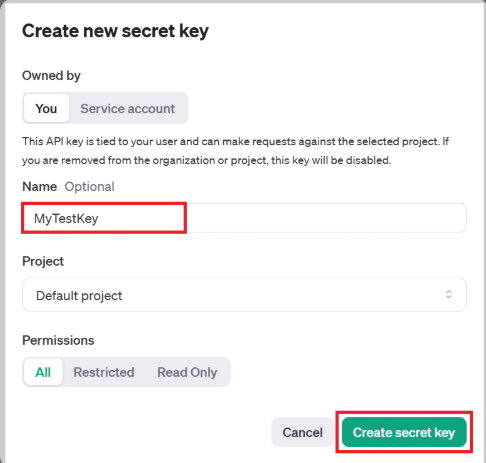 Create new secret key 버튼 클릭 후 Name에 API Key를 구분할 수 있는 나만의 이름을 작성