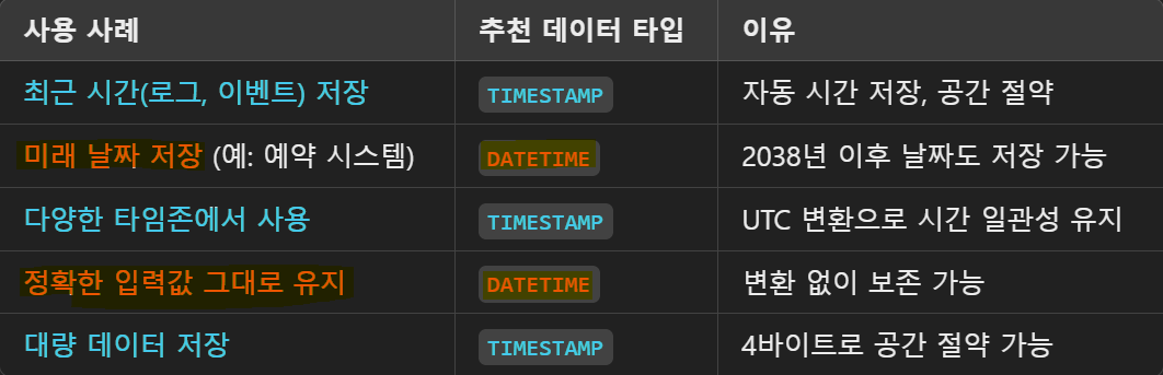 ✔ TIMESTAMP → 저장 크기가 작고 UTC 변환 기능이 있어 로그 데이터에 적합