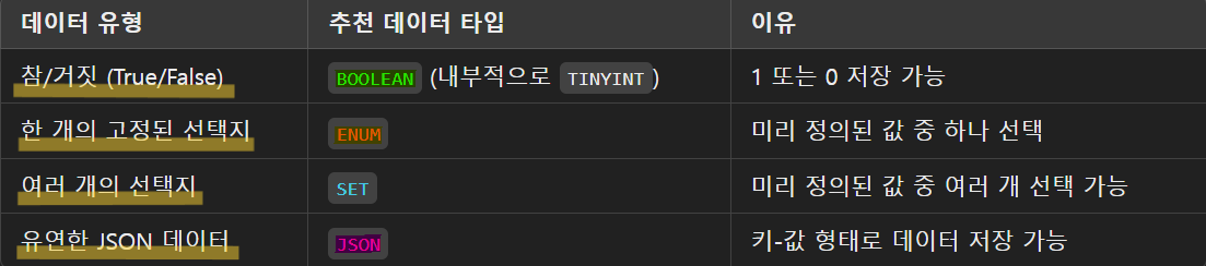 ➡️ 데이터 특성에 맞게 적절한 타입을 선택하면 성능과 저장 공간을 최적화할 수 있다.