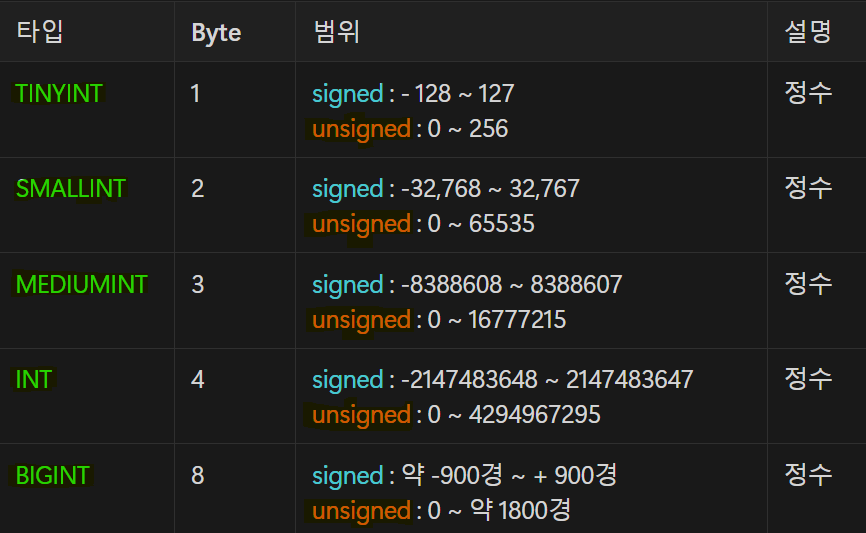 (예) INT UNSIGNED : 0 ~ 4,294,967,295