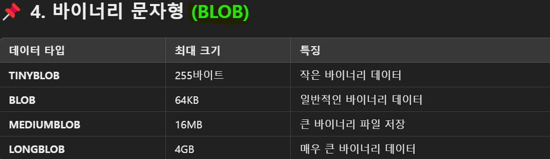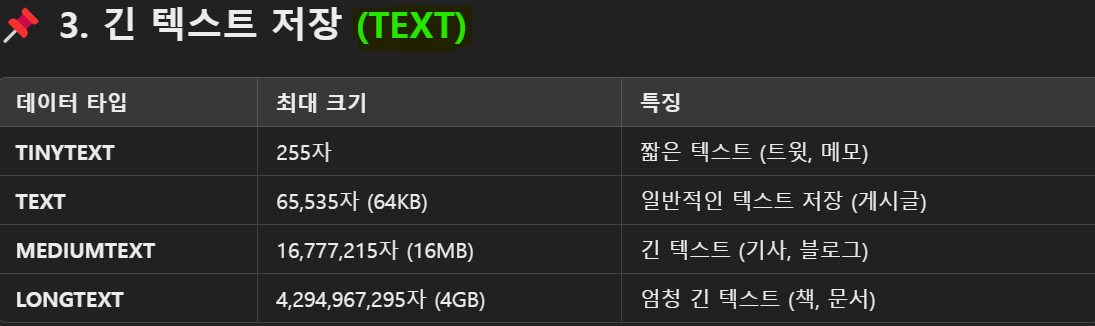 ➡️ ❗VARCHAR 보다 큰 데이터 저장 가능❗ 하지만, 인덱싱(Index) 제한이 있어서 ❗검색 속도가 느릴 수 있다❗