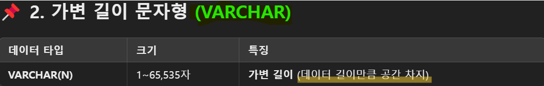 ➡️ 입력된 데이터 길이만큼만 공간을 사용하기 때문에, ❗공간을 절약할 수 있지만, 속도는 CHAR 보다 느릴 수 있다❗