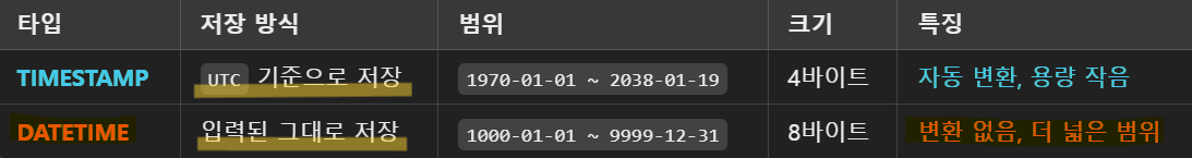 TIMESTAMP vs DATETIME 차이점둘 다 날짜와 시간(YYYY-MM-DD HH:MI:SS)을 저장하는 타입이지만, 저장 방식과 범위가 다르다