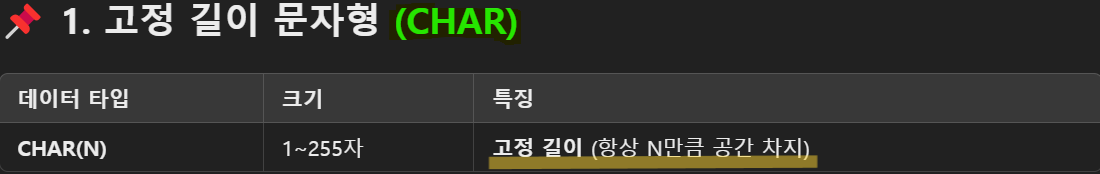 ➡️ ❓언제 쓸까?❓ 주민번호, 우편번호 등 길이가 일정한 데이터에 사용.