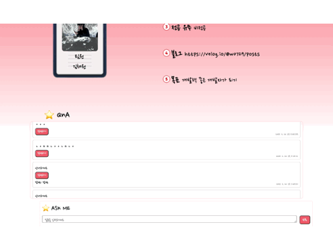 상세 페이지 하단에는 Q & A 입력란이 있고 작동 원리는 방명록과 비슷하다. 다만 답변하기 기능은 각 팀원만 할 수 있도록 비밀번호를 입력해야만 답변할 수 있도록 기능을 추가했다.
