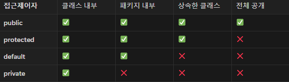 클래스 혹은 객체의 캡슐화는 접근제어자 를 통해서 구현할 수 있다